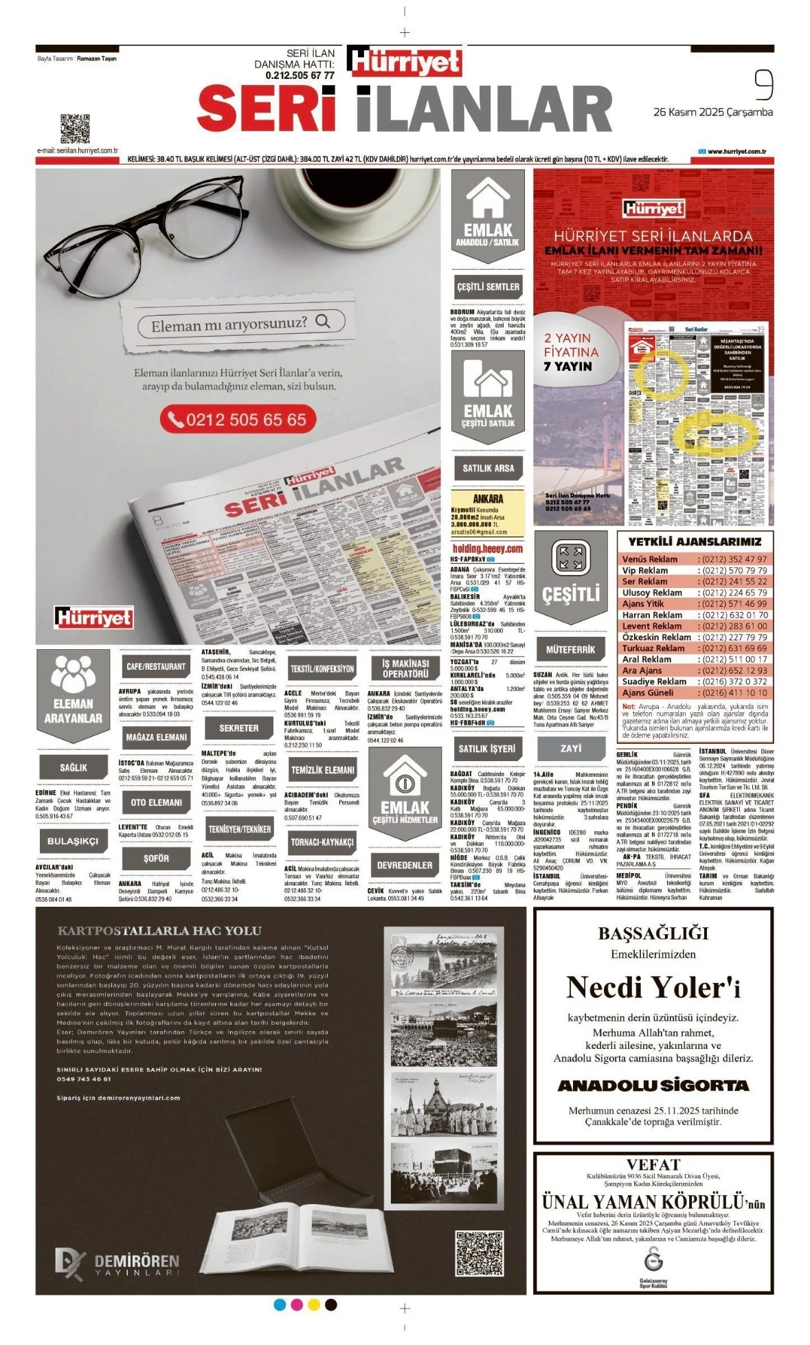 - 26 Kasım 2025 Çarşamba HÜRRİYET Vefat (Ölüm) – Başsağlığı – Anma – Teşekkür İlanları