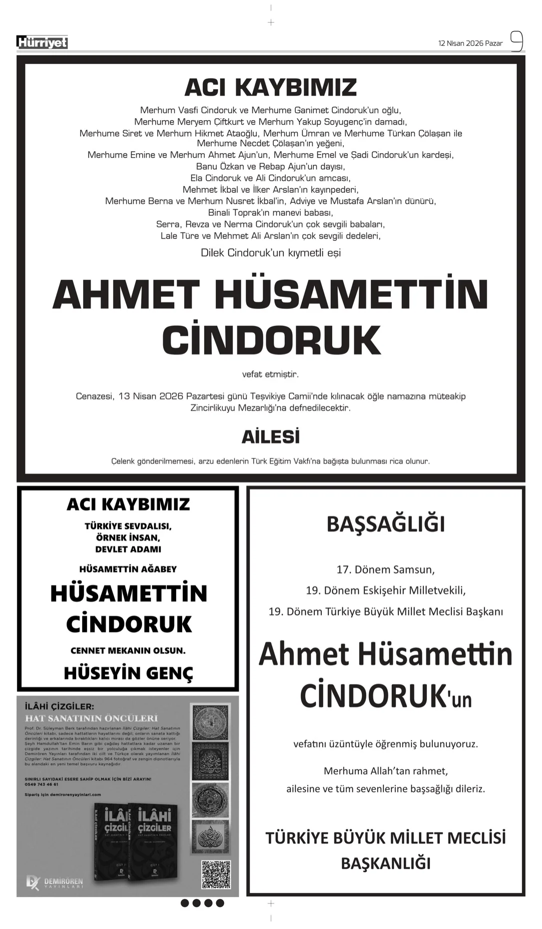 - 13 Nisan 2026 Pazartesi HÜRRİYET Vefat (Ölüm) – Başsağlığı – Anma – Teşekkür İlanları