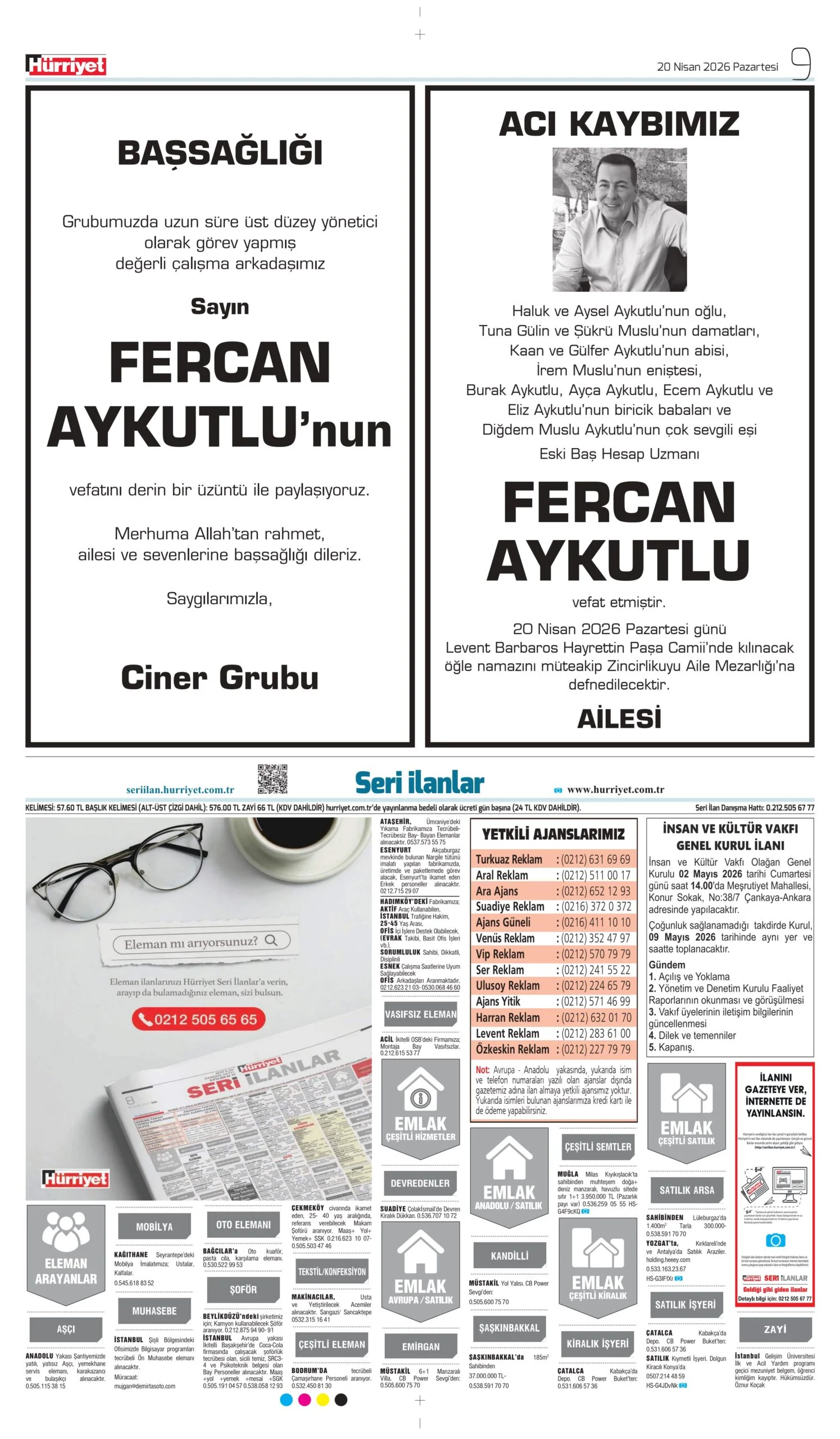 - 09 Nisan 2026 Perşembe HÜRRİYET Vefat (Ölüm) – Başsağlığı – Anma – Teşekkür İlanları