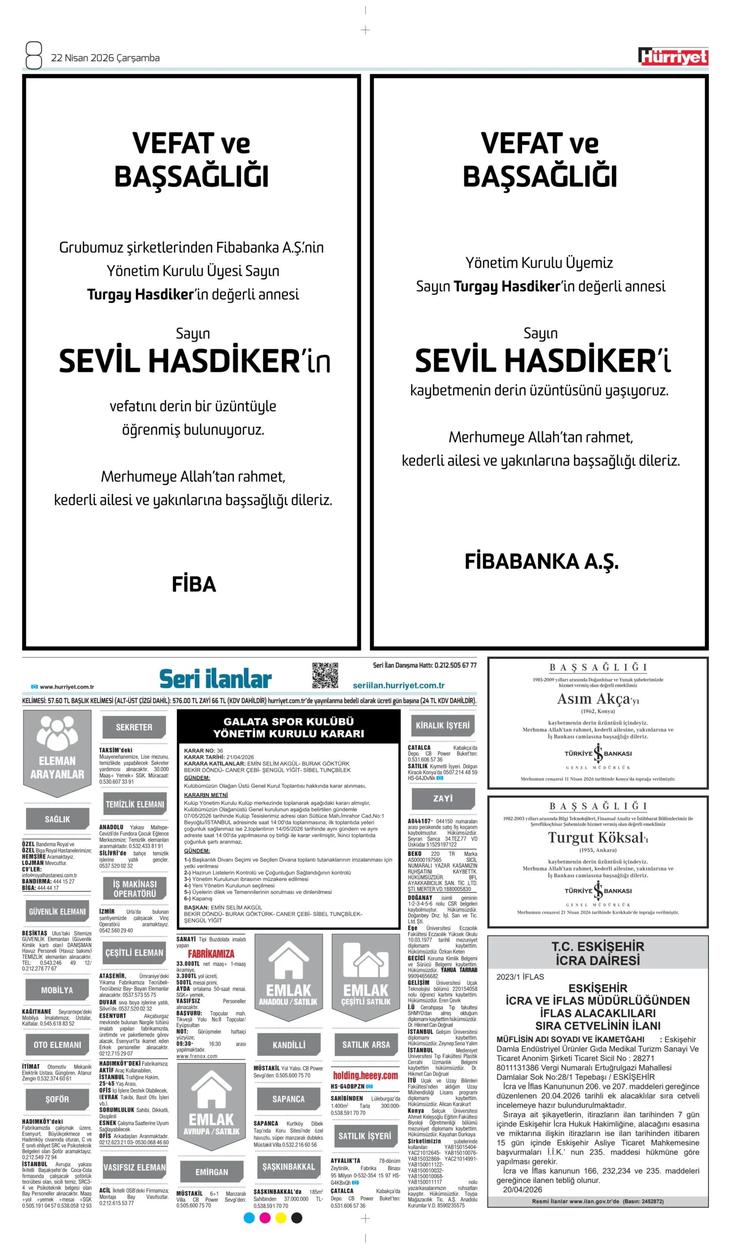 - 19 Nisan 2026 Pazar HÜRRİYET Vefat (Ölüm) – Başsağlığı – Anma – Teşekkür İlanları