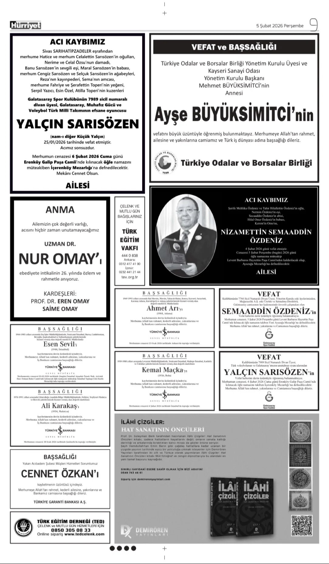 05 Şubat 2026 Perşembe HÜRRİYET Vefat (Ölüm) – Başsağlığı – Anma – Teşekkür İlanları Gönderildi: 6 Şubat 2026 - Venüs Reklam Gönderildi: Genel.