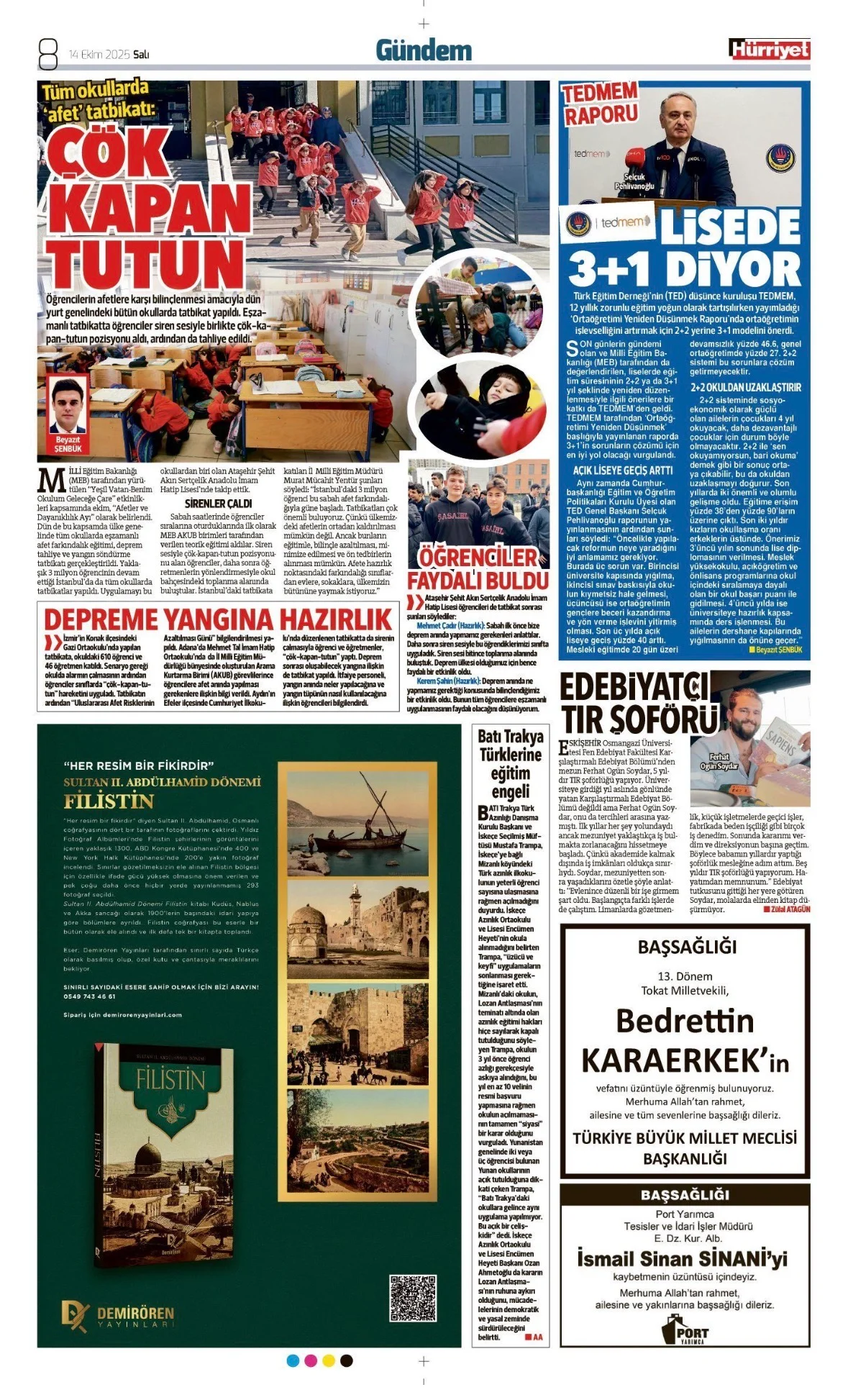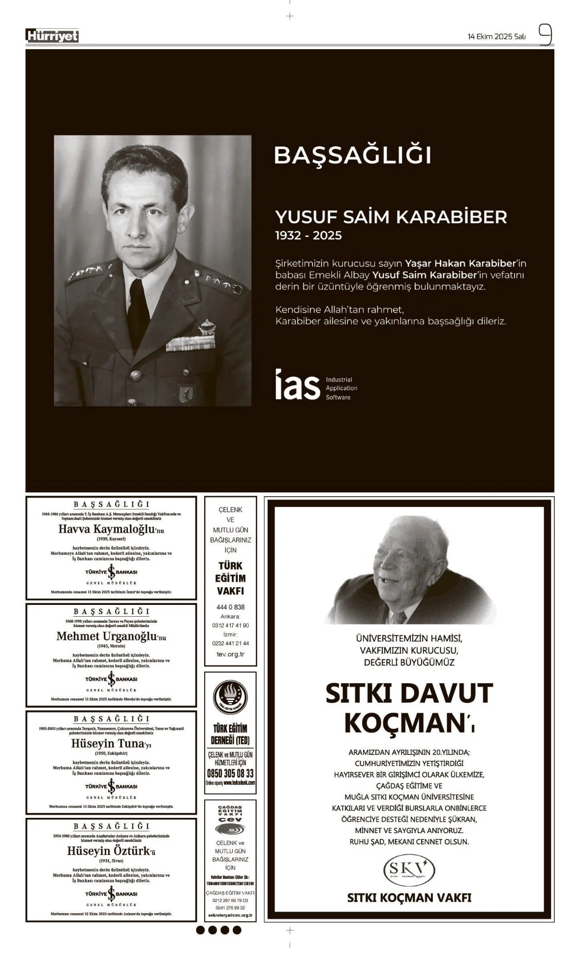 14 Ekim 2025 Salı HÜRRİYET Vefat (Ölüm) – Başsağlığı – Anma – Teşekkür İlanları Gönderildi: 17 Ekim 2025 - Venüs Reklam Gönderildi: Genel.