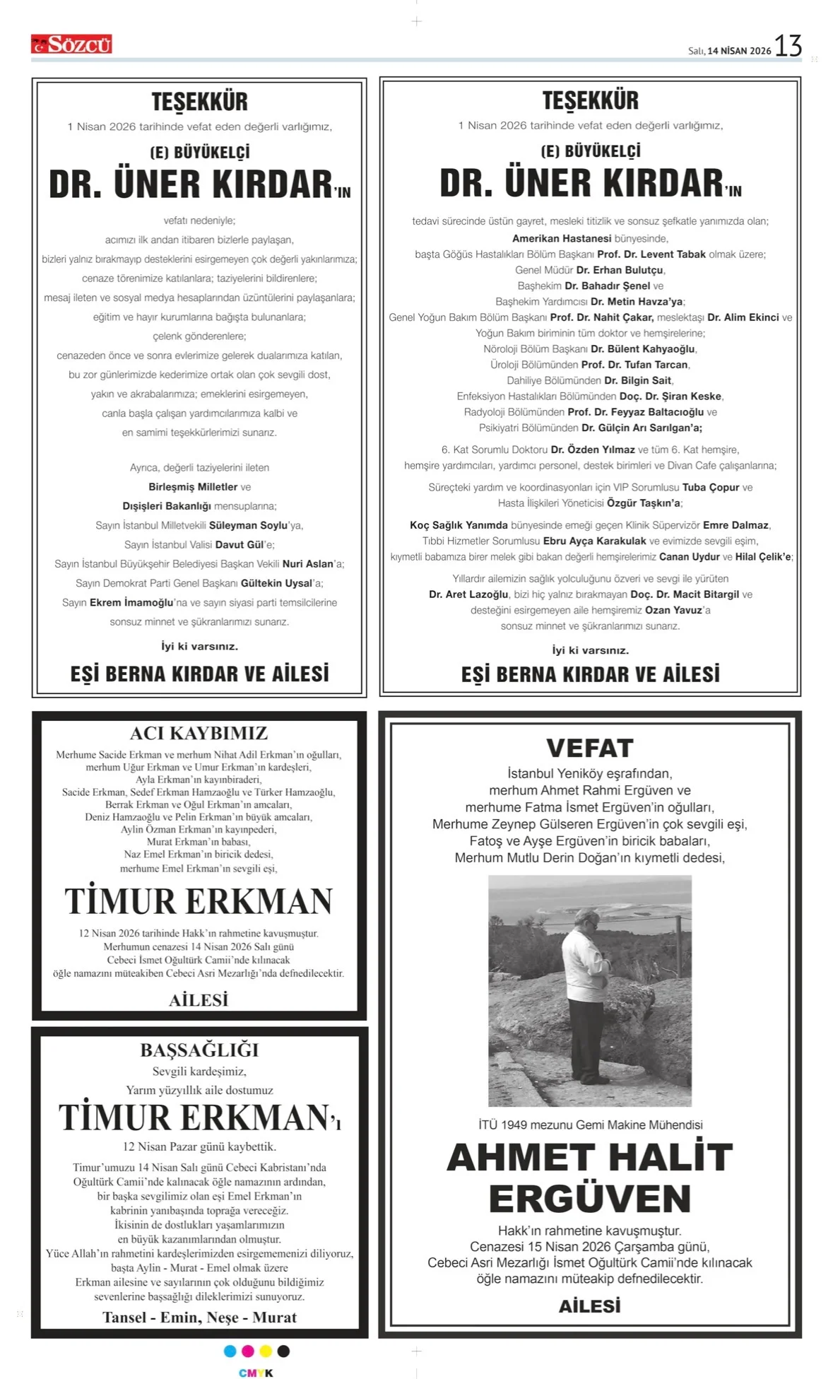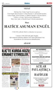 14 Nisan 2026 Salı SÖZCÜ Vefat (Ölüm) – Başsağlığı – Anma – Teşekkür İlanları Gönderildi: 20 Nisan 2026 - Venüs Reklam Gönderildi: Genel.