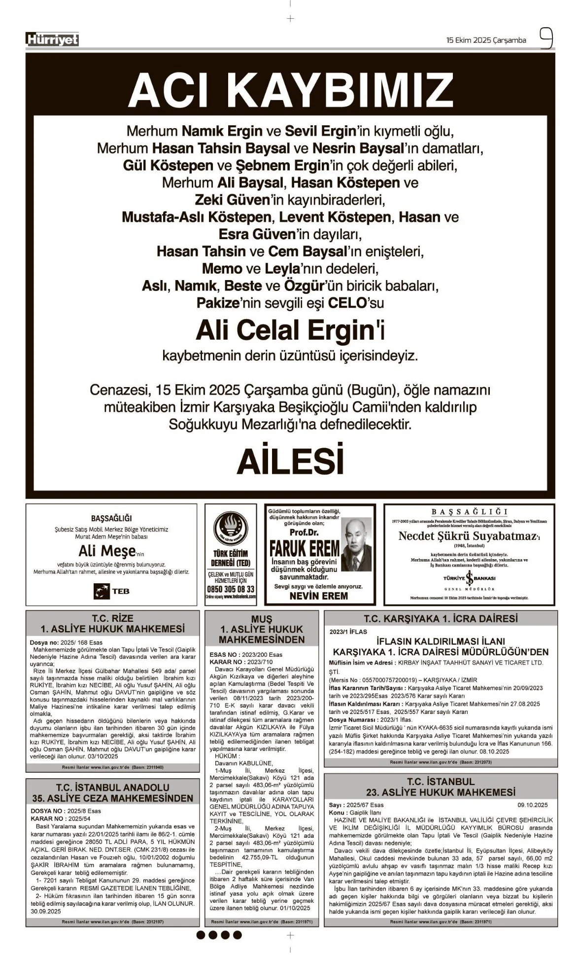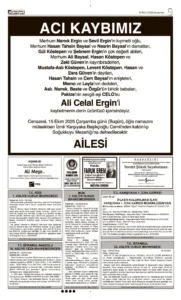 15 Ekim 2025 Çarşamba HÜRRİYET Vefat (Ölüm) – Başsağlığı – Anma – Teşekkür İlanları Gönderildi: 17 Ekim 2025 - Venüs Reklam Gönderildi: Genel.
