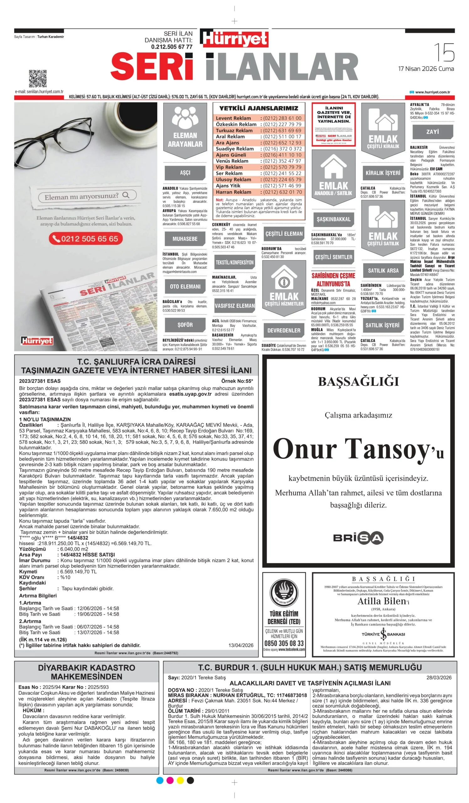 17 Nisan 2026 Cuma HÜRRİYET Vefat (Ölüm) – Başsağlığı – Anma – Teşekkür İlanları Gönderildi: 20 Nisan 2026 - Venüs Reklam Gönderildi: Genel.