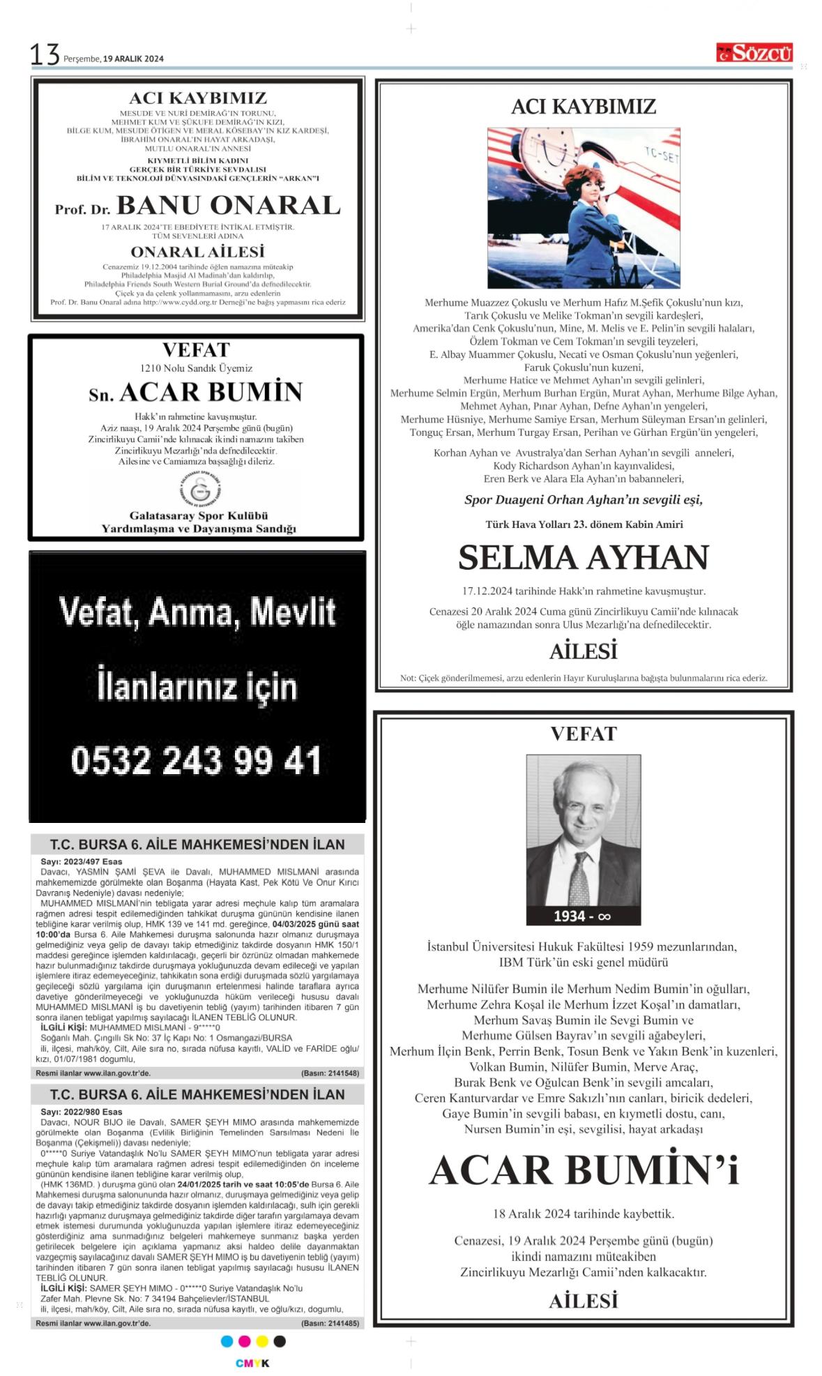 19 Aralık 2024 Perşembe SÖZCÜ Vefat (Ölüm) – Başsağlığı – Anma – Teşekkür İlanları Gönderildi: 19 Aralık 2024 - Venüs Reklam Gönderildi: Genel.