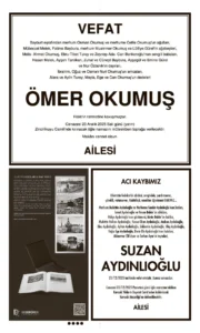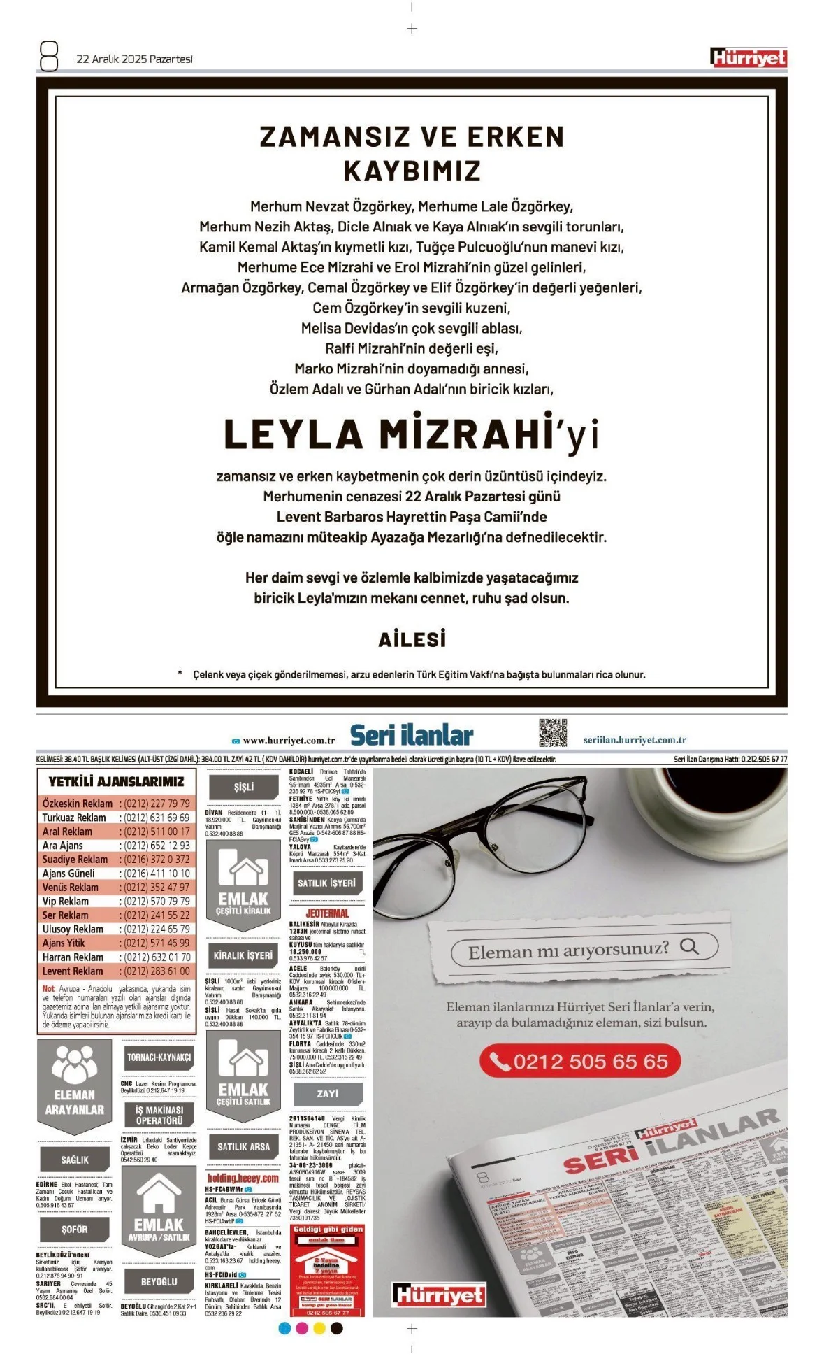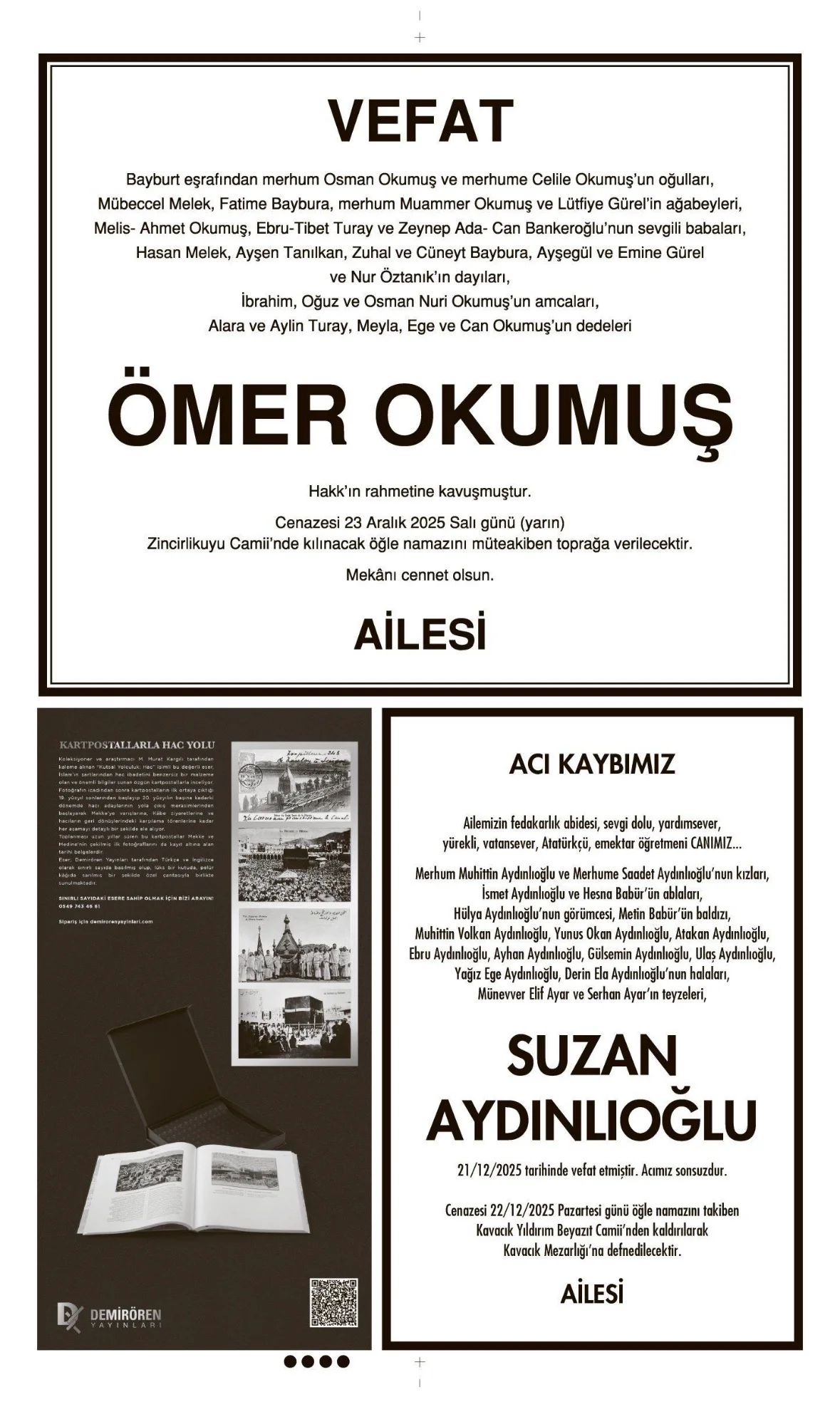 22 Aralık 2025 Pazartesi HÜRRİYET Vefat (Ölüm) – Başsağlığı – Anma – Teşekkür İlanları Gönderildi: 24 Aralık 2025 - Venüs Reklam Gönderildi: Genel.