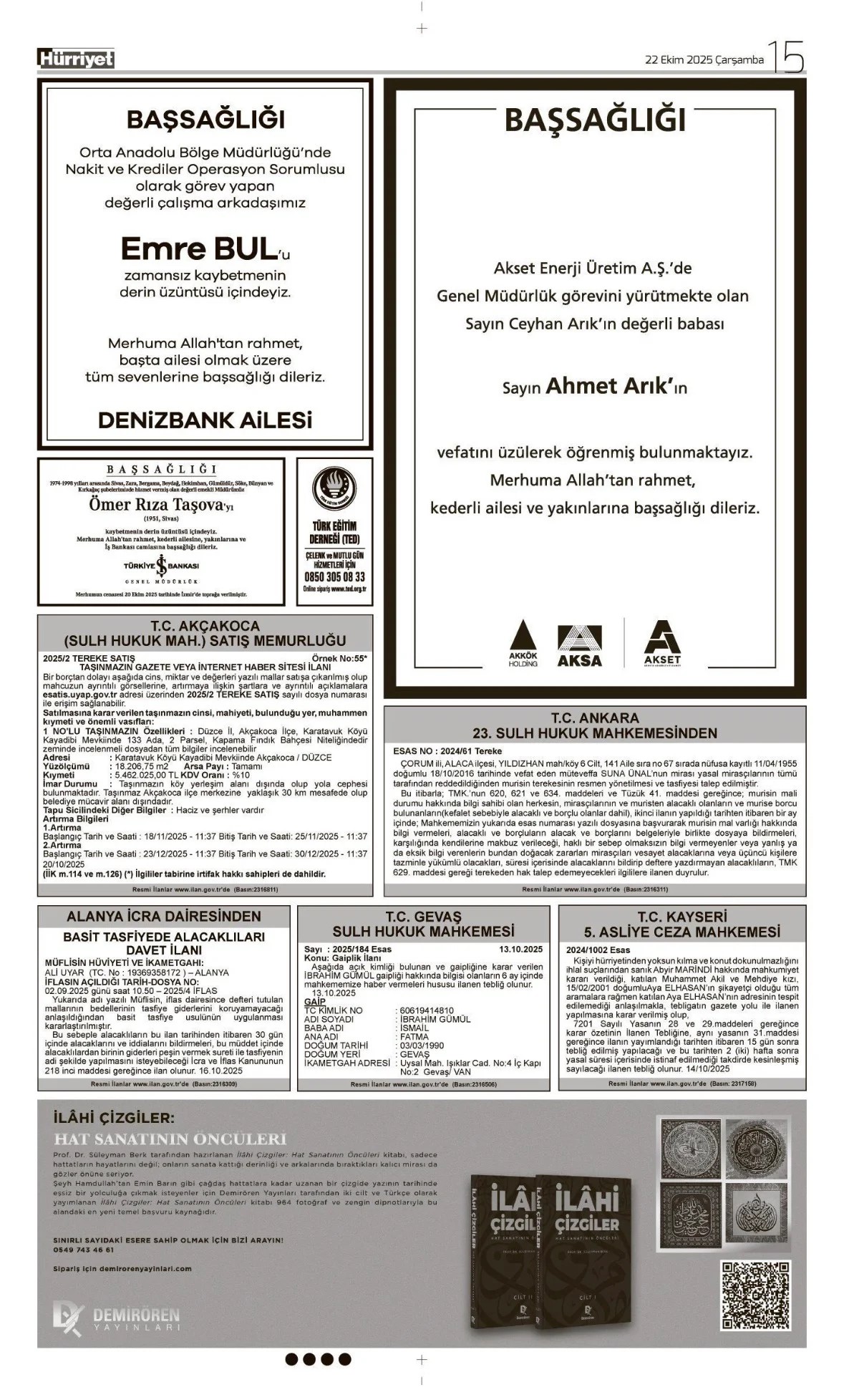 22 Ekim 2025 Çarşamba HÜRRİYET Vefat (Ölüm) – Başsağlığı – Anma – Teşekkür İlanları Gönderildi: 22 Ekim 2025 - Venüs Reklam Gönderildi: Genel.