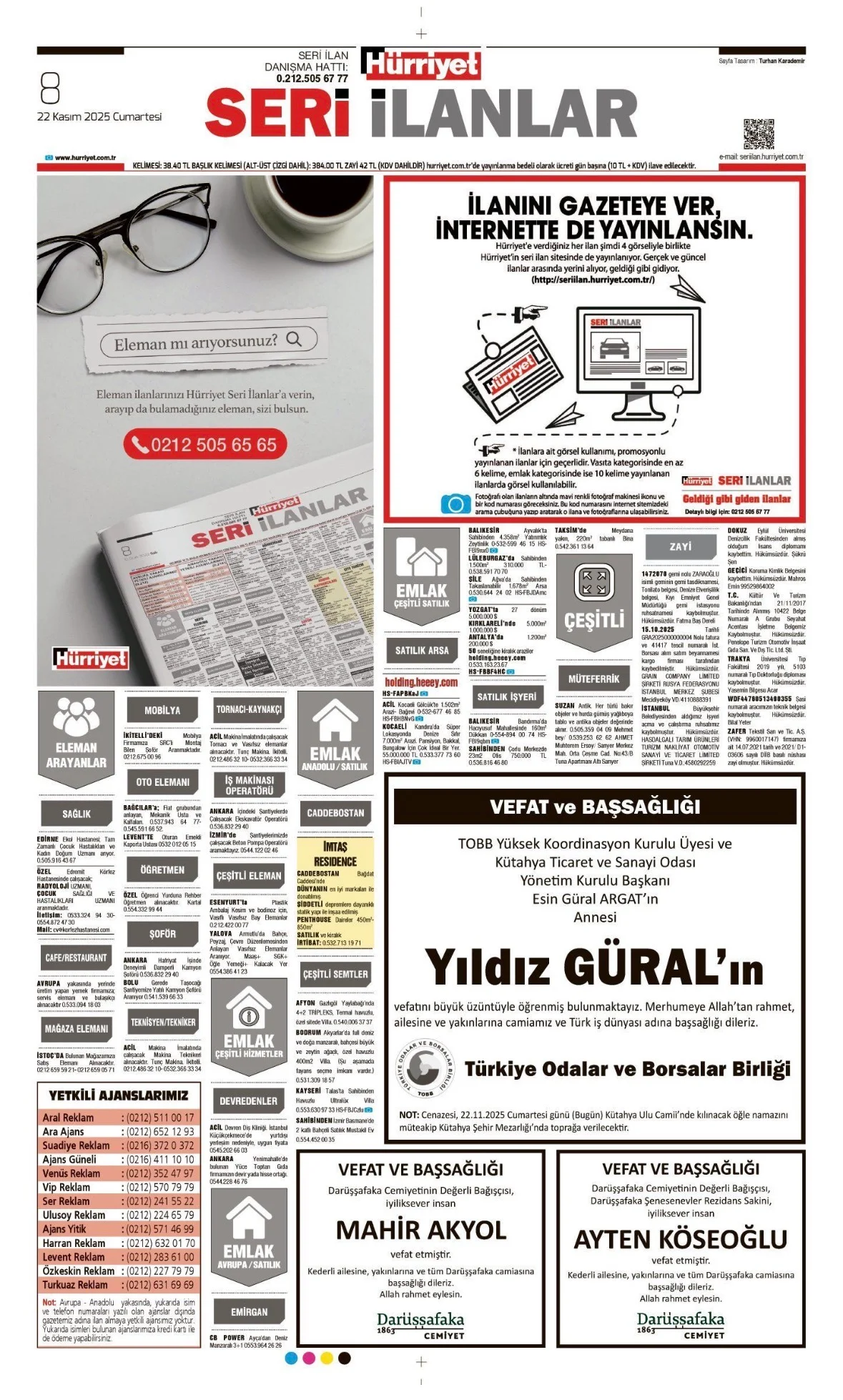 22 Kasım 2025 Cumartesi HÜRRİYET Vefat (Ölüm) – Başsağlığı – Anma – Teşekkür İlanları Gönderildi: 25 Kasım 2025 - Venüs Reklam Gönderildi: Genel.