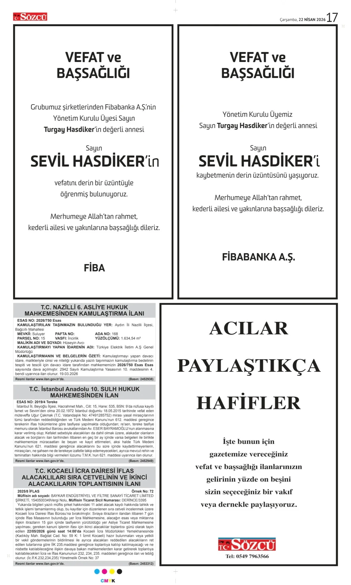 22 Nisan 2026 Çarşamba SÖZCÜ Vefat (Ölüm) – Başsağlığı – Anma – Teşekkür İlanları Gönderildi: 23 Nisan 2026 - Venüs Reklam Gönderildi: Genel.