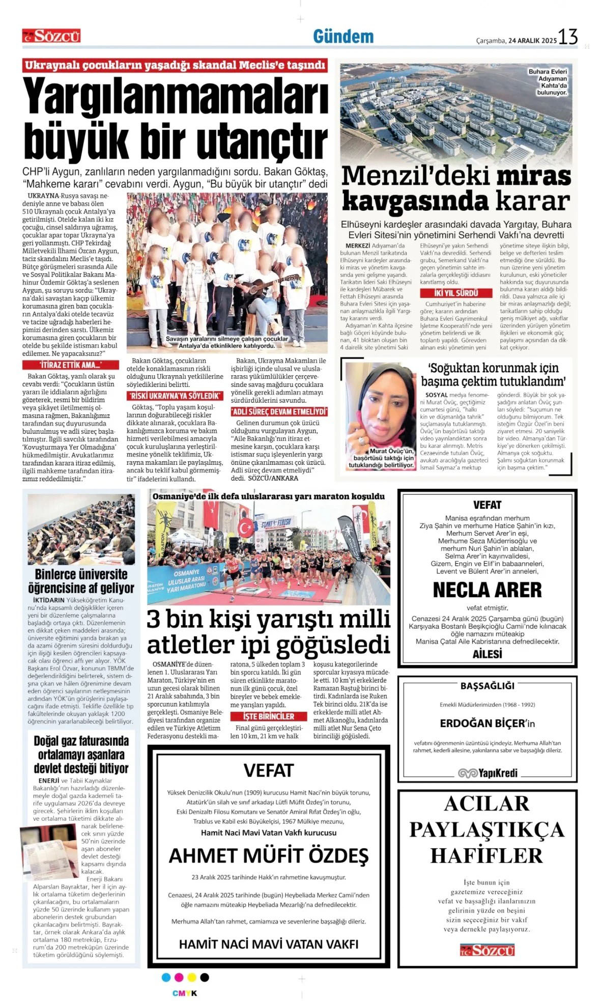 24 Aralık 2025 Çarşamba SÖZCÜ Vefat (Ölüm) – Başsağlığı – Anma – Teşekkür İlanları Gönderildi: 26 Aralık 2025 - Venüs Reklam Gönderildi: Genel.