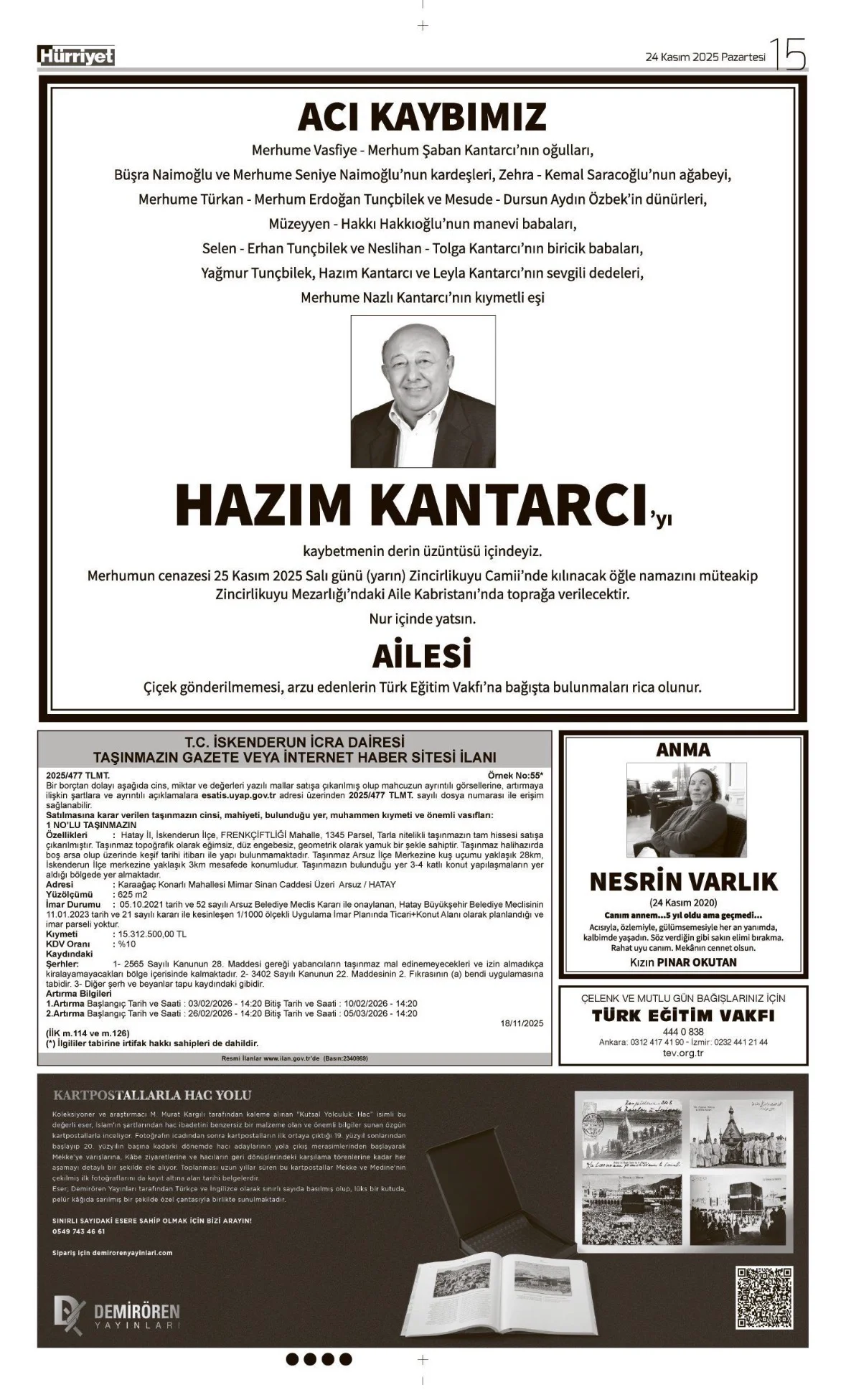 24 Kasım 2025 Pazartesi HÜRRİYET Vefat (Ölüm) – Başsağlığı – Anma – Teşekkür İlanları