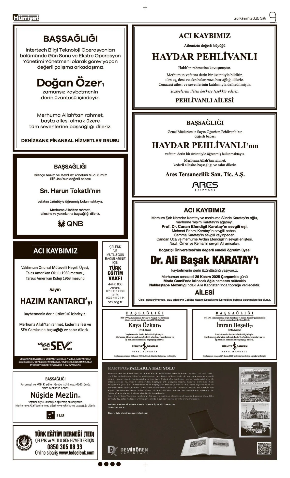 25 Kasım 2025 Salı HÜRRİYET Vefat (Ölüm) – Başsağlığı – Anma – Teşekkür İlanları Gönderildi: 25 Kasım 2025 - Venüs Reklam Gönderildi: Genel.