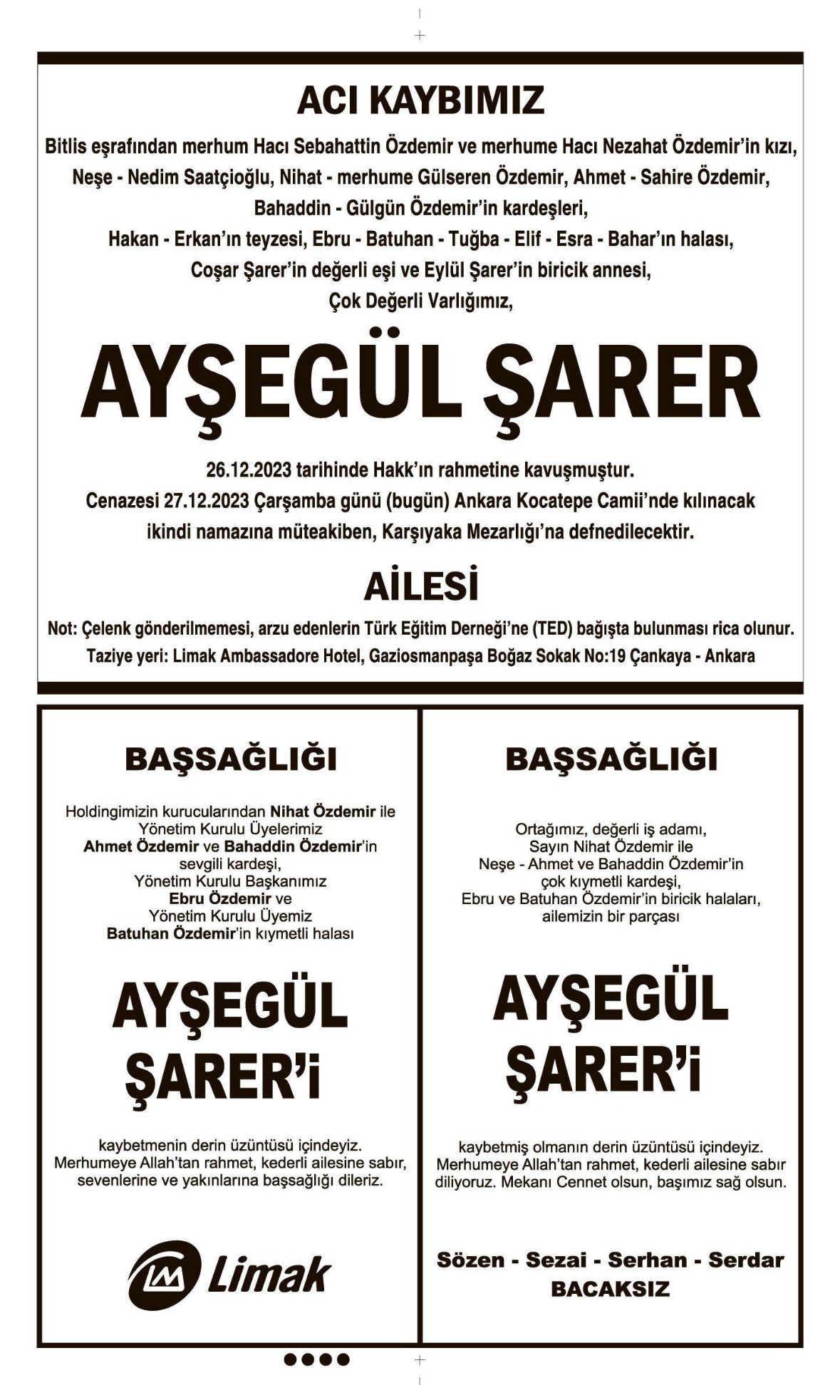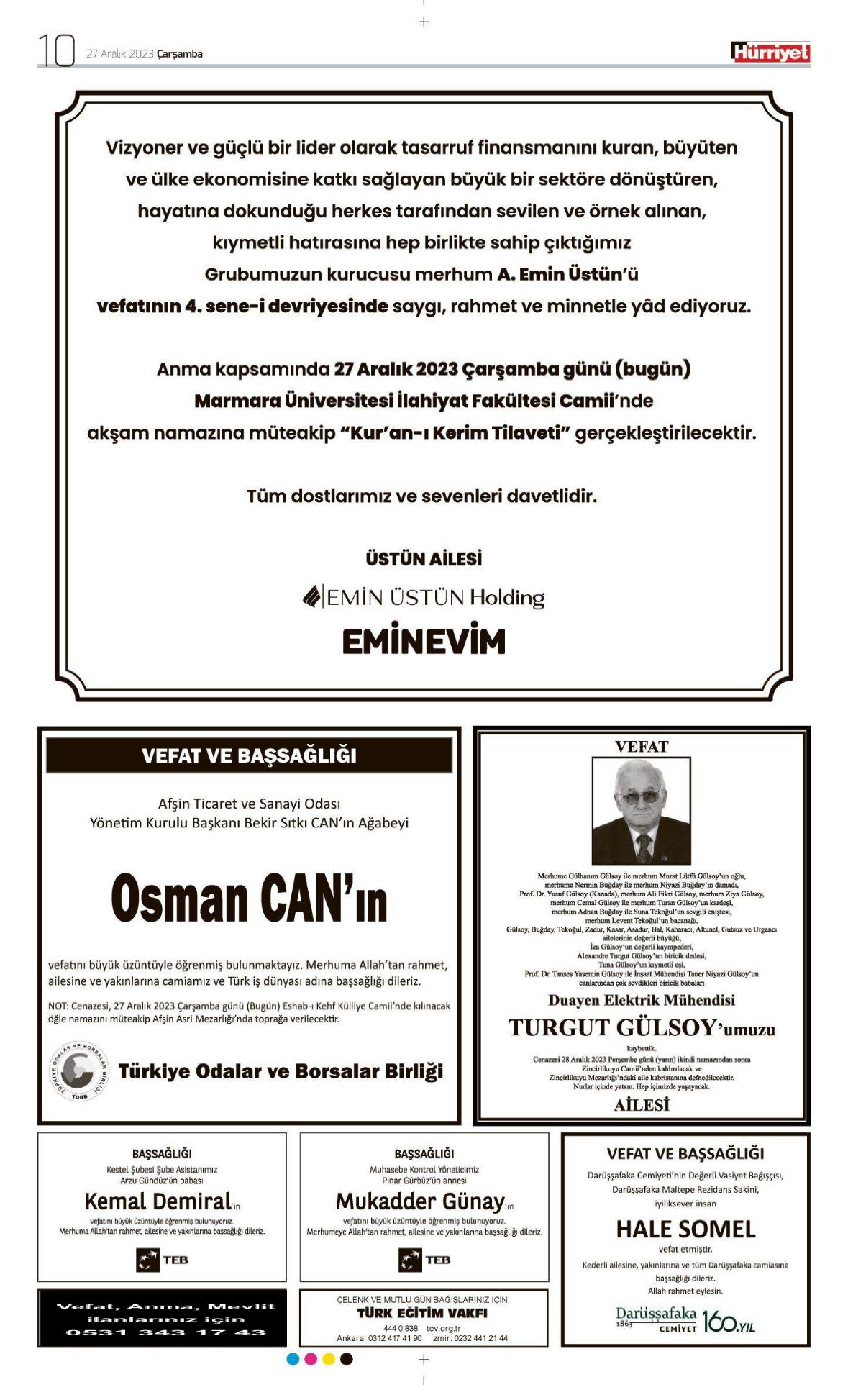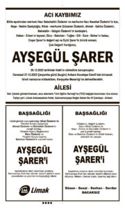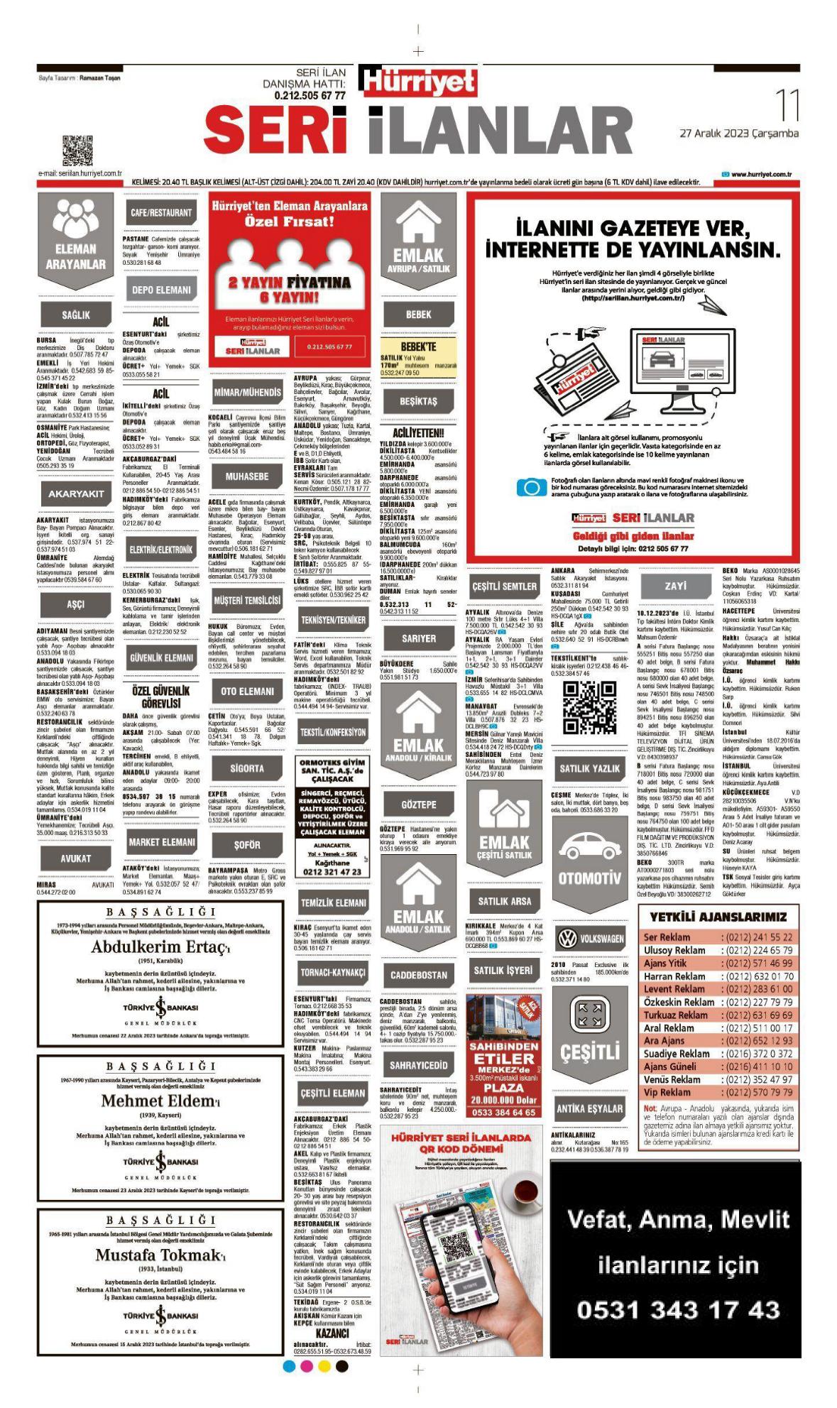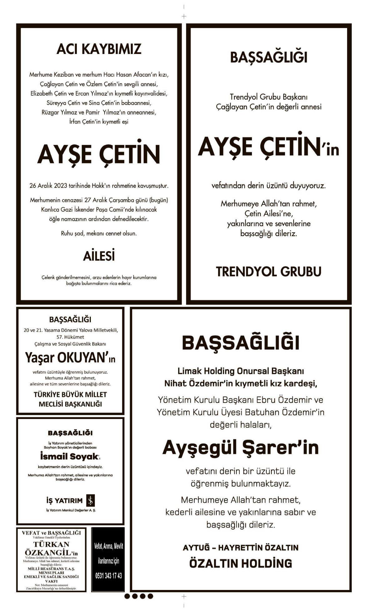 27 Aralık 2023 Çarşamba HÜRRİYET Vefat (Ölüm) – Başsağlığı – Anma – Teşekkür İlanları Gönderildi: 27 Aralık 2023 - Venüs Reklam Gönderildi: Genel.